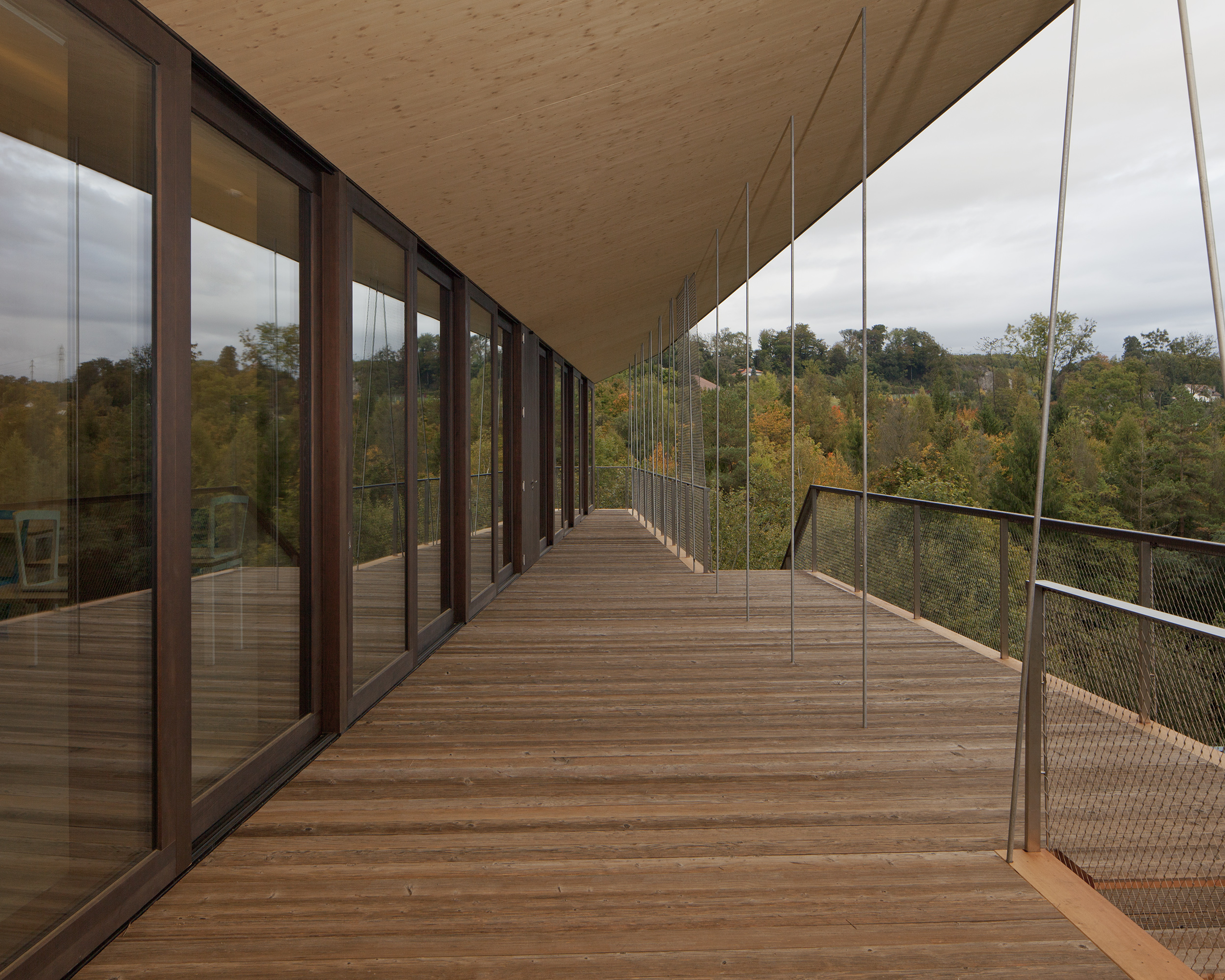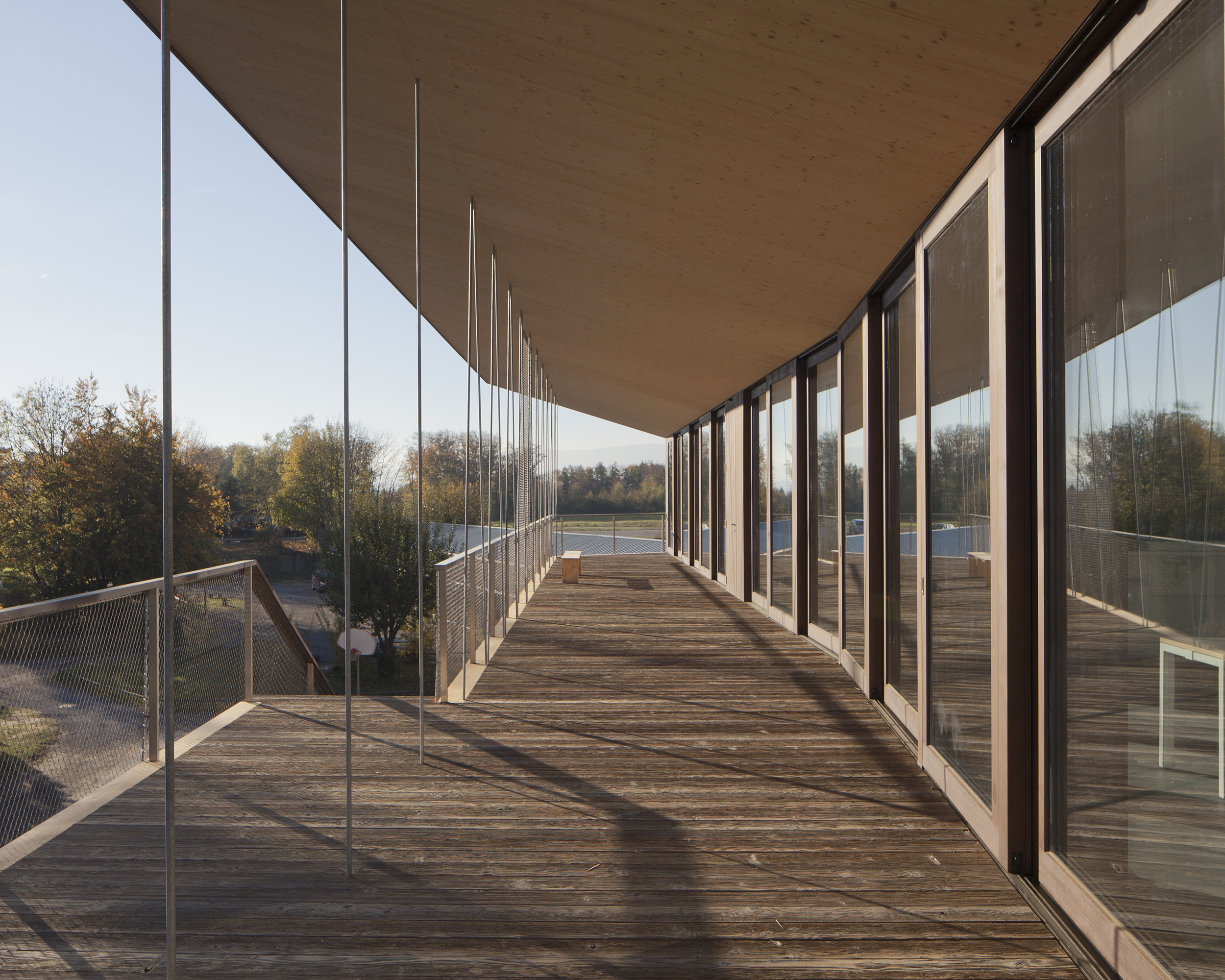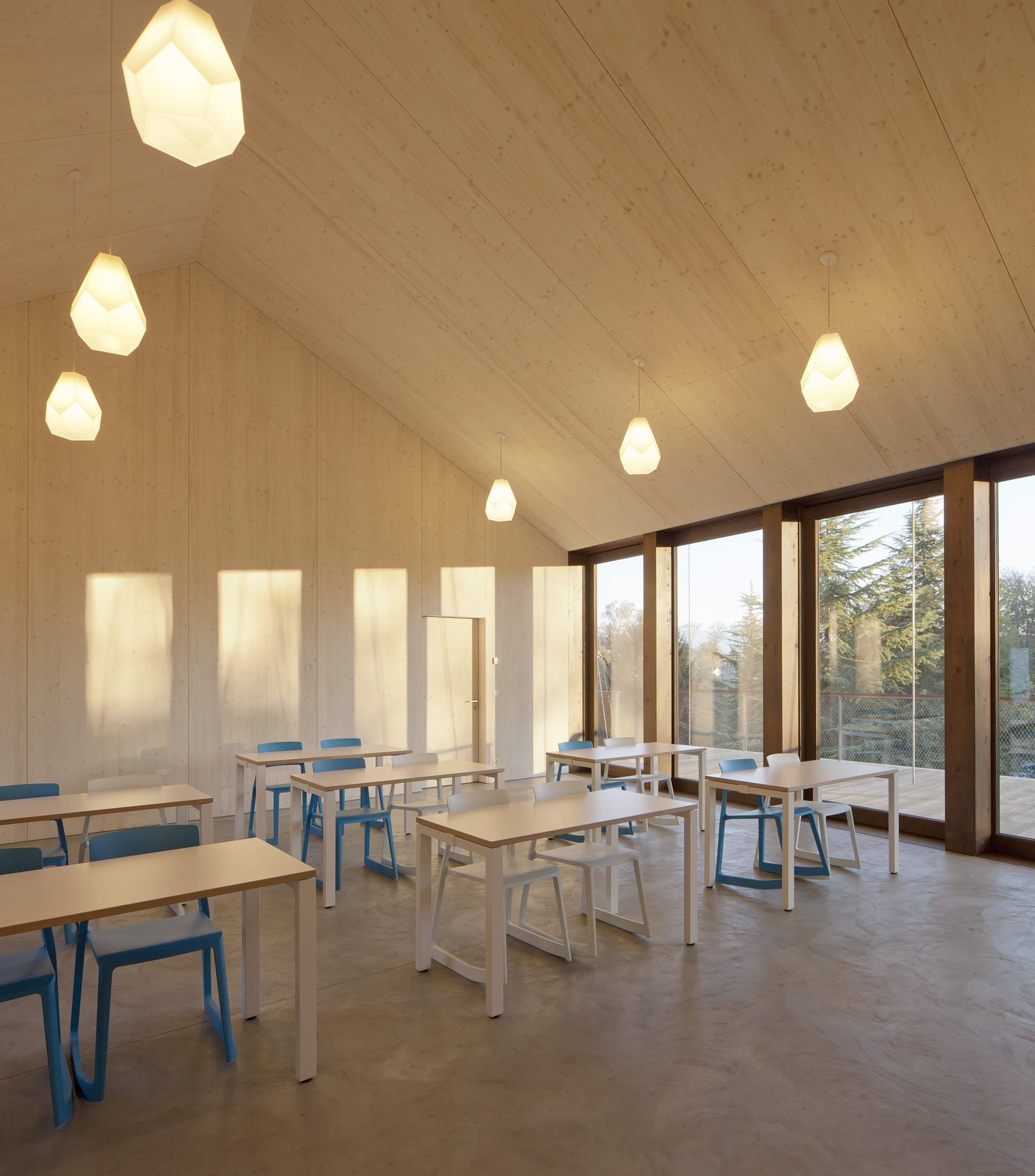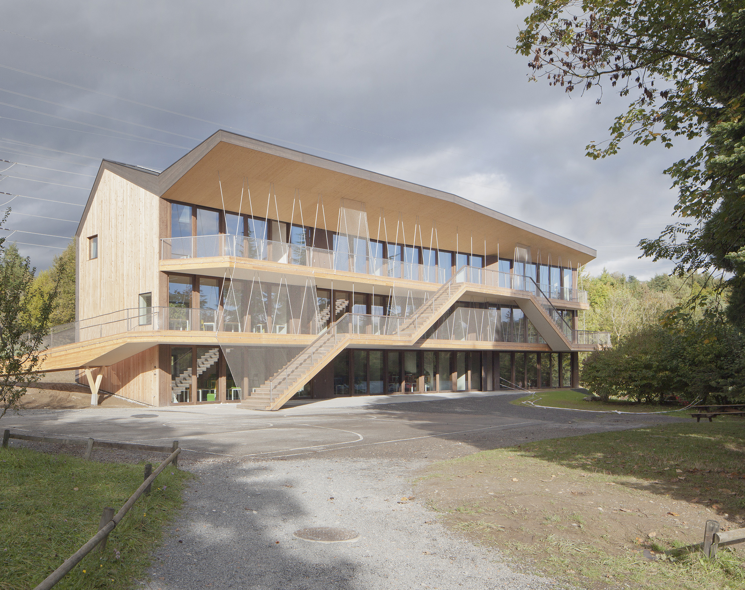 Création d’un bâtiment scolaire d’une capacité de 130 élèves, sur trois niveaux, entièrement réalisé en bois avec des coulissantes à levage en bois, épicéa naturel.