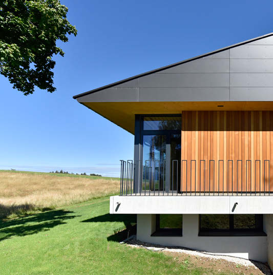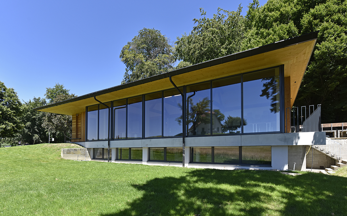 Les grandes baies vitrées bois-métal réalisées en poteaux-traverses 76mm sans seuil dégagent une vue exceptionnelle sur la nature environnante, la colline et en arrière plan le Lac Léman.