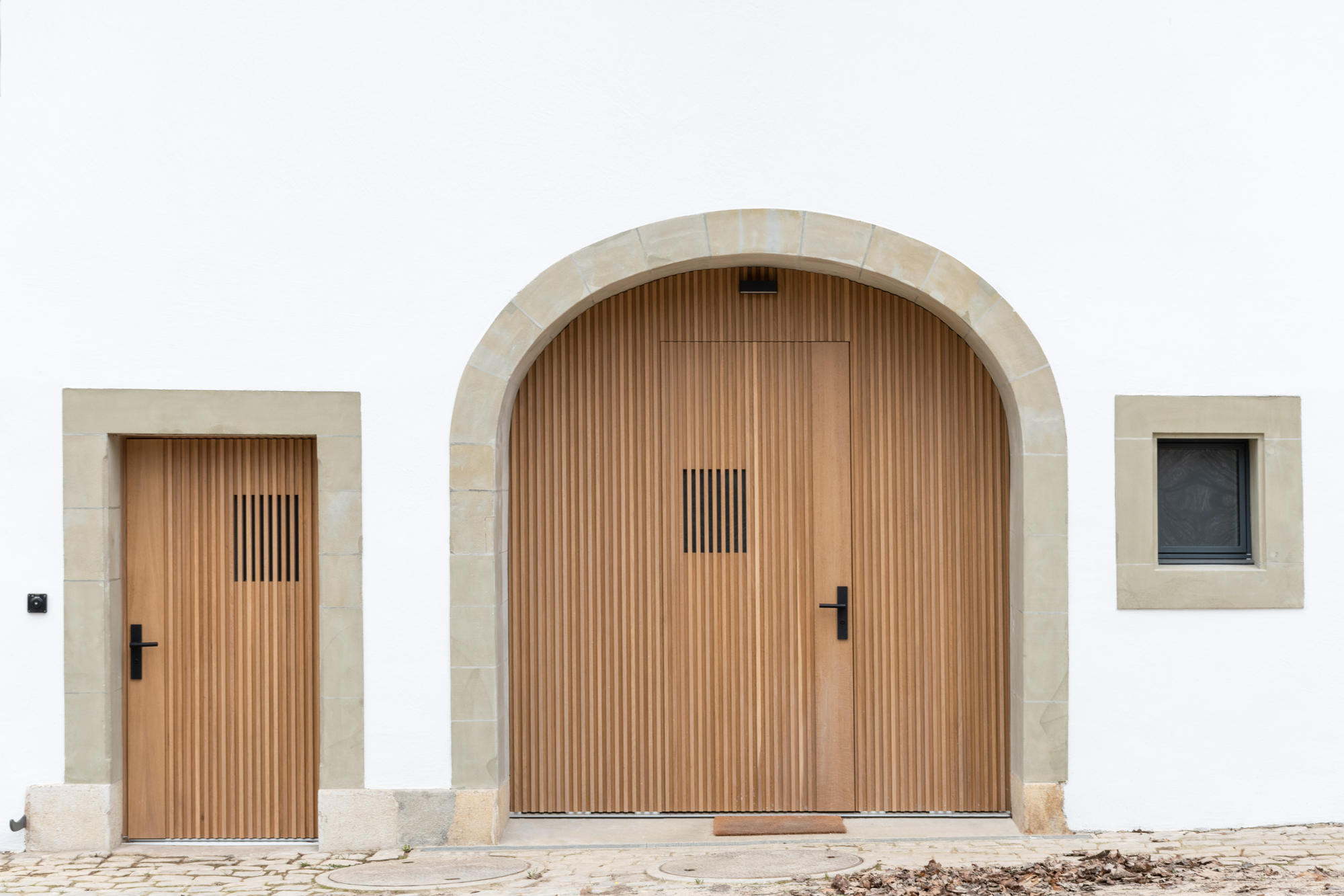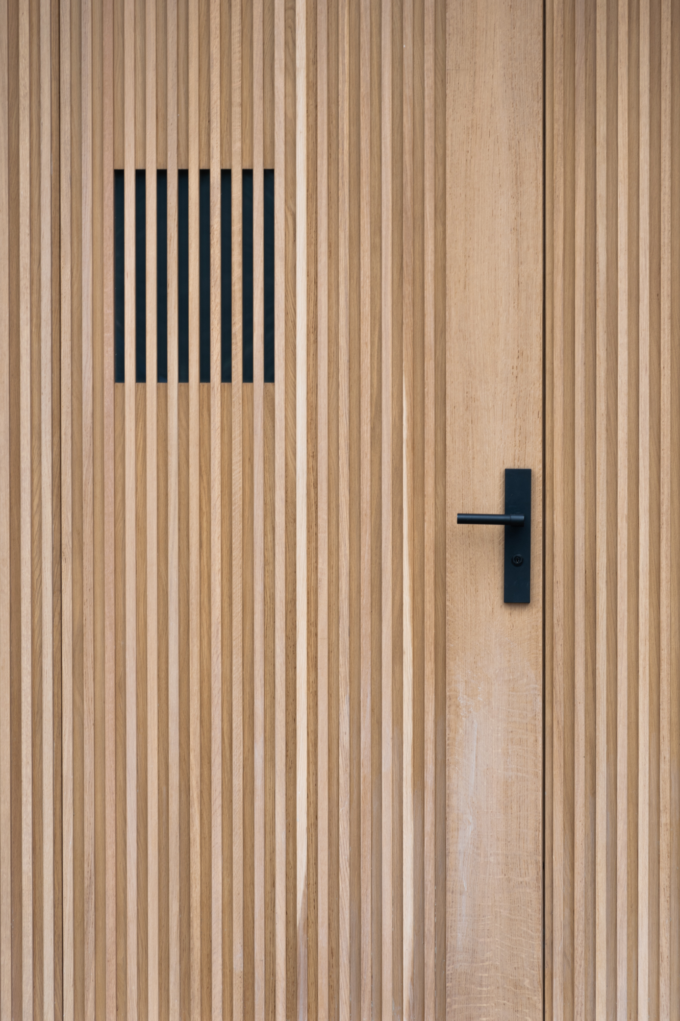 Portes en chêne avec claustra extérieure ajustée au chantier.