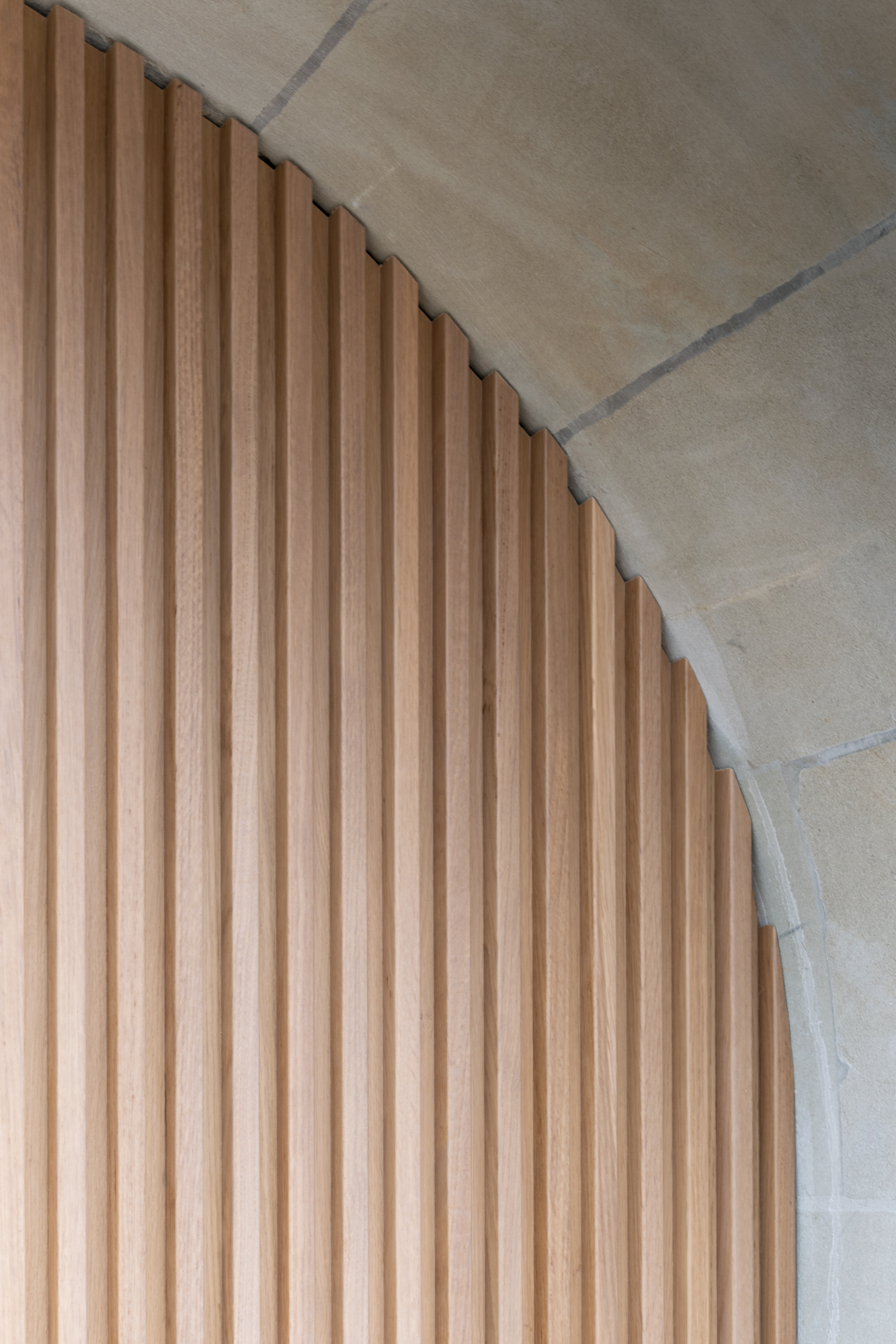 Portes en chênes avec ouverture vitrée et claustra en chêne ajustée au chantier.